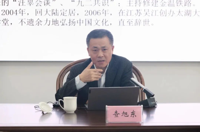 查旭东先生回顾介绍了南怀瑾先生平凡而又不凡的一生,也简要介绍了南师的子女后人及学生代表。特别介绍了南怀瑾先生在促进两岸和谈交流、主持修建金温铁路、重修人文大道,尤其在传播、弘扬中华优秀传统文化等方面的贡献。