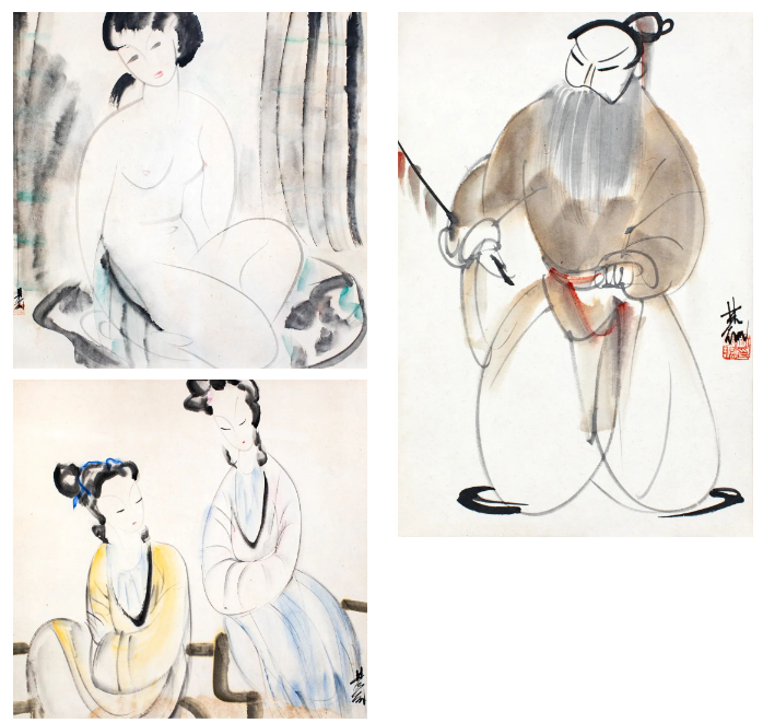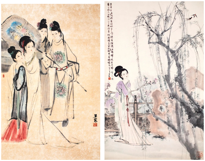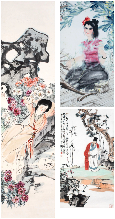 刘旦宅先生可谓是温州一代画画人的偶像,旦宅先生的仕女画典雅清丽、高格脱俗的品位,恐当代无人居其右。他的人物画造型取晋唐宋风,人物衣纹线条则以行草书笔法写之。他当年在温州图书馆个展的讲座题目大致是:中国哲学体系中的书法与西方哲学体系中的艺术之区别。旦宅先生的人物画兼工带写,其写意的配景也画得严谨精彩,据说他作画都先打底稿详细推敲待满意后再画到宣纸上。他作画时一般不让家人和朋友进入其画室,可见其认真专注的程度。