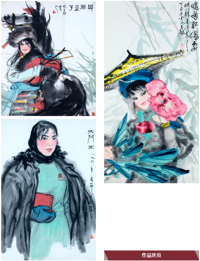 周昌谷先生的现代水墨人物画在用色上的浓艳不俗,其画面的用水、用色、用墨、用线的有机融合,既厚重又明亮有力,并形成了个人独特的艺术形式和符号技法特征,品位高雅,看周先生的人物开脸:红勃勃的脸蛋,一双乌黑水汪汪眼睛,用排笔画浓发其髙光处用细笔疏出,发尾处用散笔枯笔一笔带过画出发丝的韵致,他的许多颜色所用矿物质或国外进口,所以一直明艳滋润,东方现代水墨人物画之美被提升到炉火纯青的境界。