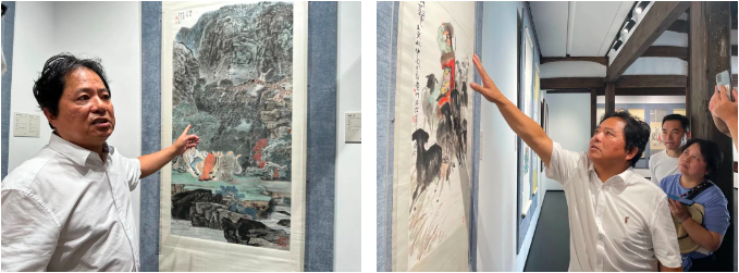 金老师对每幅作品的画面特色都作了个人的品读介绍,尤对"虎溪三笑”的巨幅作品赞不绝口,他说这个题材被古今画家画烂了,以前旦宅先生也画过此题并刊其画册,传统经典题材如何在画坛上出新、如何有深度,此本身就是一个挑战。
