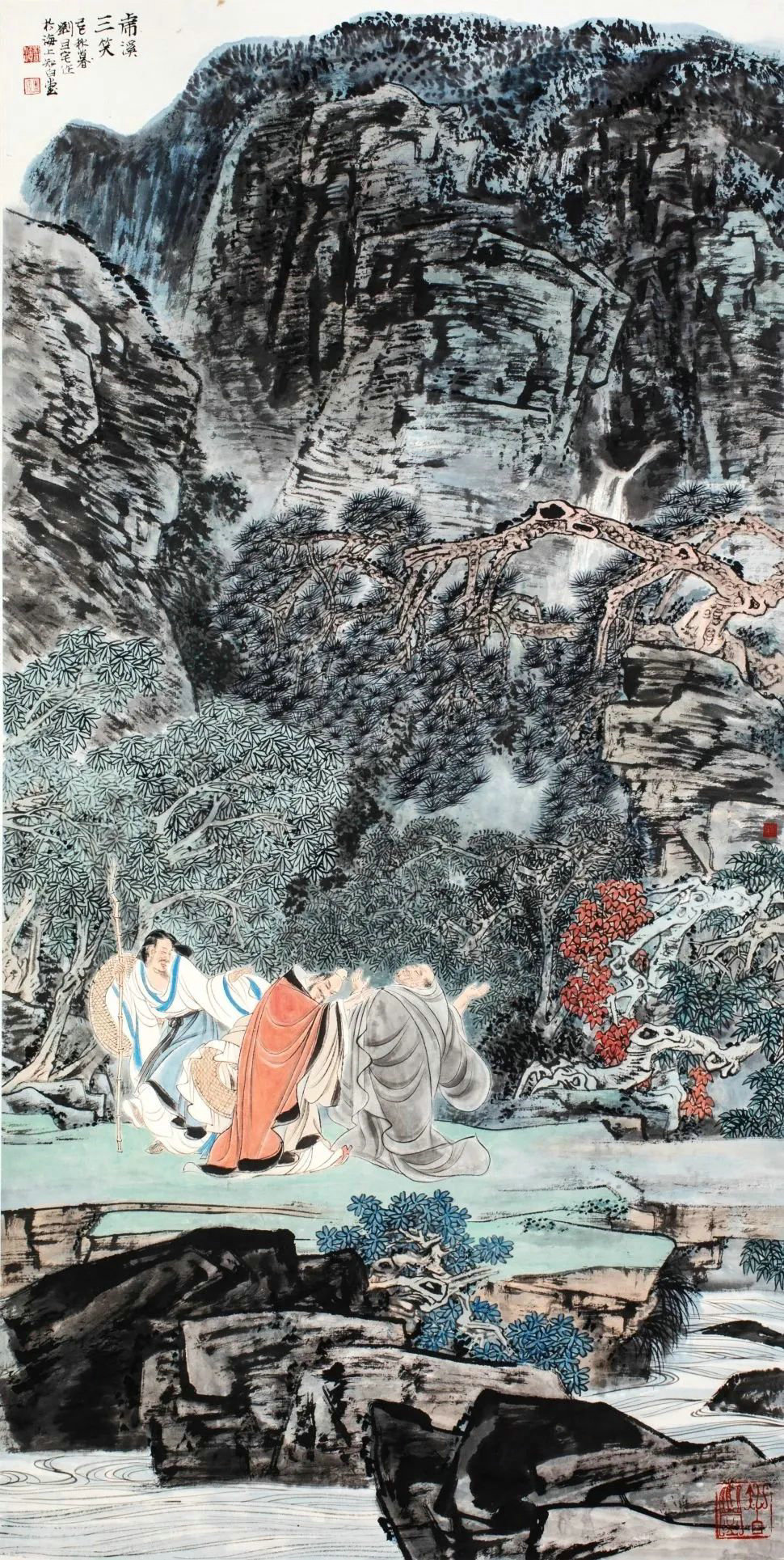 旦宅先生此幅虎溪三笑人物动态夸张,有汉画像石造型和顾恺之衣纹相结合的风味。背景则以北宋山水严密丰富的结构形式,画得深入而层次分明,树木的姿态与人物动态手势互为呼应,风姿卓绝的横卧松柏背后一含而不露的瀑布而下,构成瀑布的哗哗声和人物的笑声在空谷山野中交响回荡,中国唐宋绘画中的“绘声绘色”之传统得以传承和深化的表现。观旦宅先生此作可谓高山仰止!