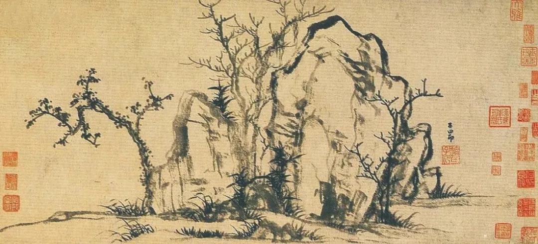这是赵孟頫在《秀石疏林图》上的题诗,讲的是书画一体的理念。“石如飞白”——它这个画中,石头是用书法中飞白的笔法画的,所谓飞白,就是一种受匠人粉刷墙壁启发而创造出来的笔法。“木如籀”,籀就是书法中的大篆。“写竹还应八法通”,元代柯九思论画竹:“写干用篆法,枝用草书法,写叶用八分或鲁公(即颜真卿)撇笔法。”古人讲,多文善画,文和纹是相通的;善书者善画,书法和绘画也是相通的。