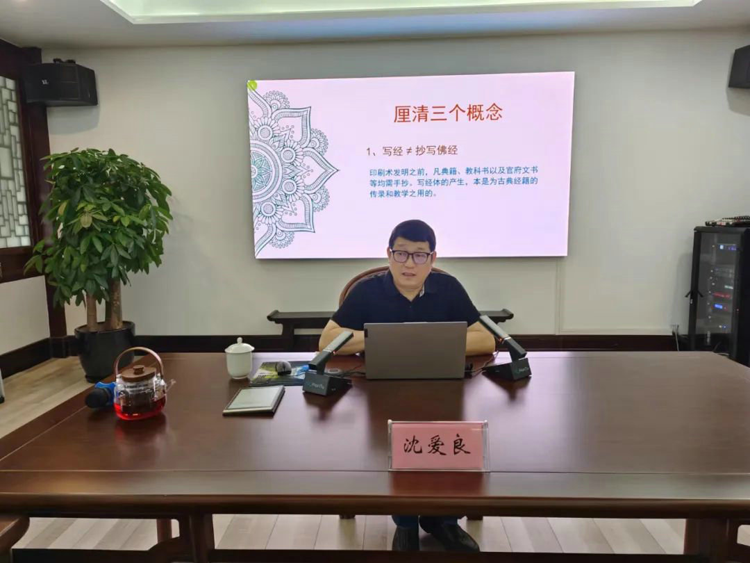 讲座伊始,沈老师先向在场观众厘清了三个概念:写经不等于抄写佛经、写经不等于有宗教信仰、写经不等于书法创作,并通过展示相关的图录作补充说明。