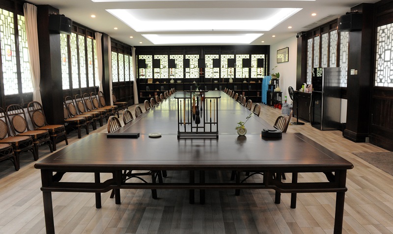 蹈和馆古色古香,透露着浓浓的人文气息,正门口处悬挂“南怀瑾书院”的匾额,两侧房柱上配有“上下五千年纵横十万里,经纶三大教出入百家言”的对联。书院一层设有生平馆、翰墨馆、多媒体功能厅等。其中面积最大、坐北朝南的一间房是介绍南怀瑾老师事迹的生平馆。记者看到,馆内分故园旧踪、求学问道、台湾岁月、情系故里等板块,通过图文介绍,对南怀瑾一生的生平事迹作了回顾,其中不乏一些珍贵老照片。