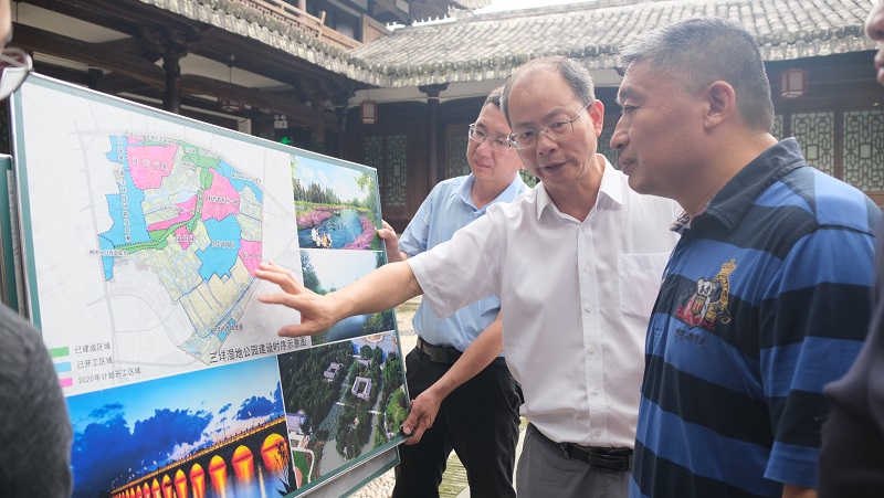 在三垟湿地,李中文一行从行水三垟广场出发,先后到520城市客厅、五福源、南怀瑾书院等景点参观。