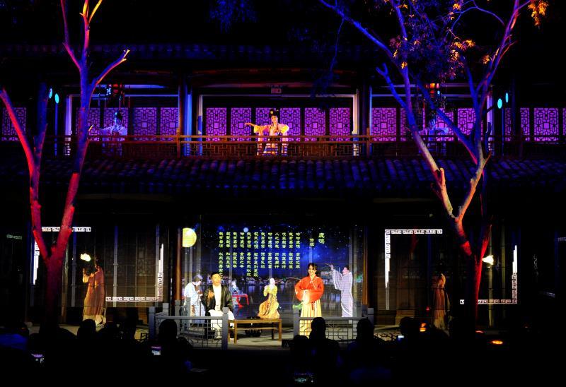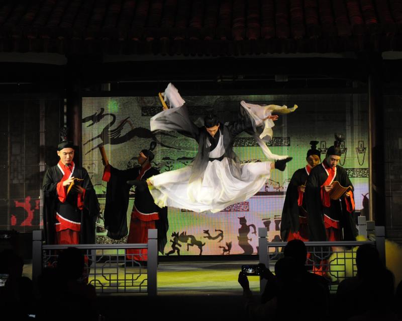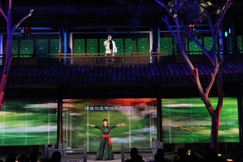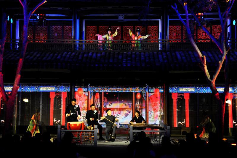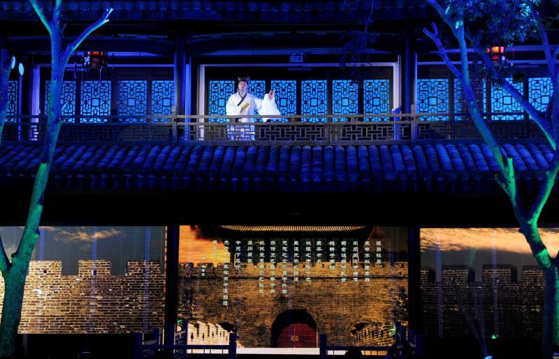 一跨进书院的大门,记者大吃一惊。黑压压200多号南怀瑾的粉丝已将小院子“塞满”。古筝雅乐一响,灯光一亮,跟记者想象中的吟诵音乐会全然不同!没有传统的舞台,书院的楼阁楼上楼下变成了双层舞台;演员有的在楼上演,有的在楼下演,回型的走廊皆成舞台,布景用冰屏纱幕式呈现,整个是环罩式的实景演出,演员和观众融为一体,仿佛都进入那个年代。