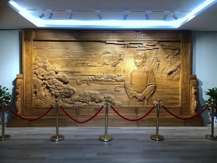 叶萌春介绍,木雕屏主画面以南怀瑾先生的肖像为主,画面融入温州的元素,包括温州的市树‘榕树’、郭公山,背景还融入了江心屿、楠溪江、雁荡山以及南怀瑾先生故居等画面。